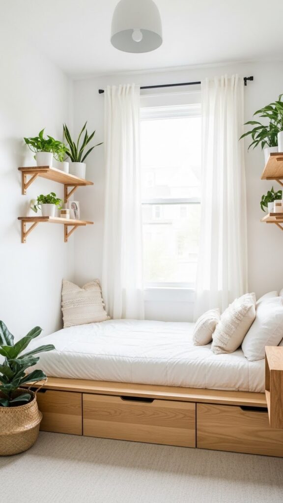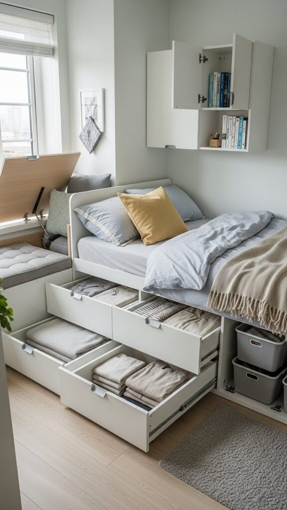 Under-bed storage is the most obvious yet often underutilized space in small bedrooms. Whether you choose a bed with built-in drawers, use rolling storage containers, or opt for a hydraulic lift bed that reveals cavernous storage underneath, this space can accommodate a surprising amount.