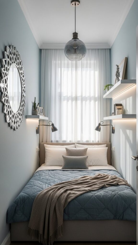 Mirrored closet doors are a classic small-bedroom solution for good reason. They eliminate the need for a separate full-length mirror while making the room feel twice as large. If you’re renting and can’t install mirrored doors, consider hanging mirrors on the outside of closet doors or positioning a large freestanding mirror nearby.