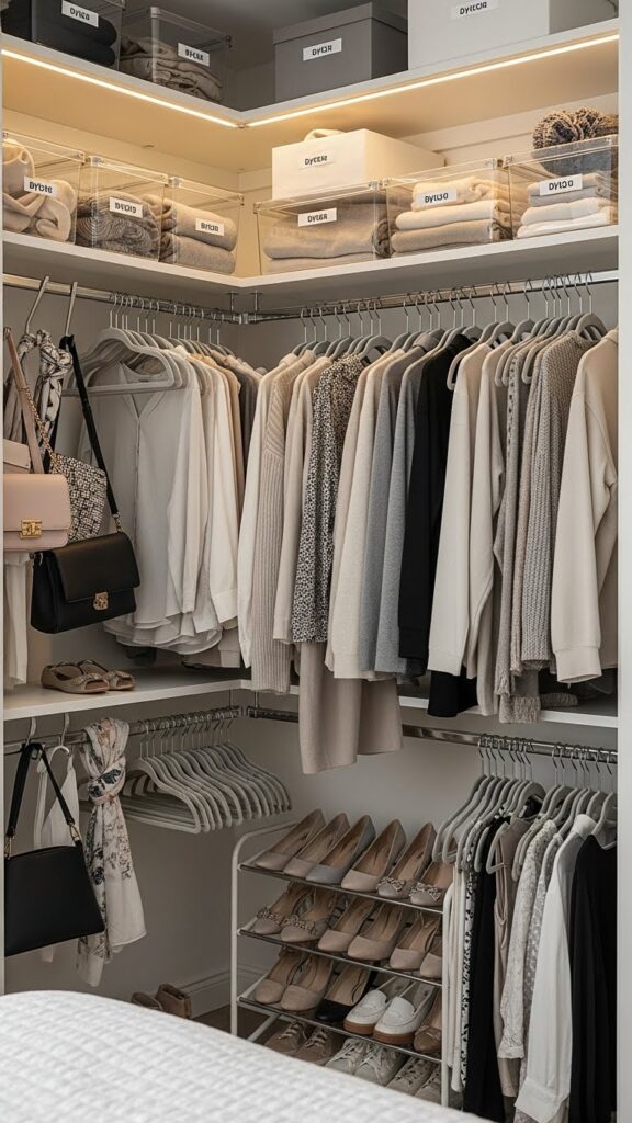 Use clear storage boxes or bins on upper shelves to store seasonal items, special occasion clothing, or accessories. Being able to see what’s inside saves time and prevents you from buying duplicates of things you forgot you owned.