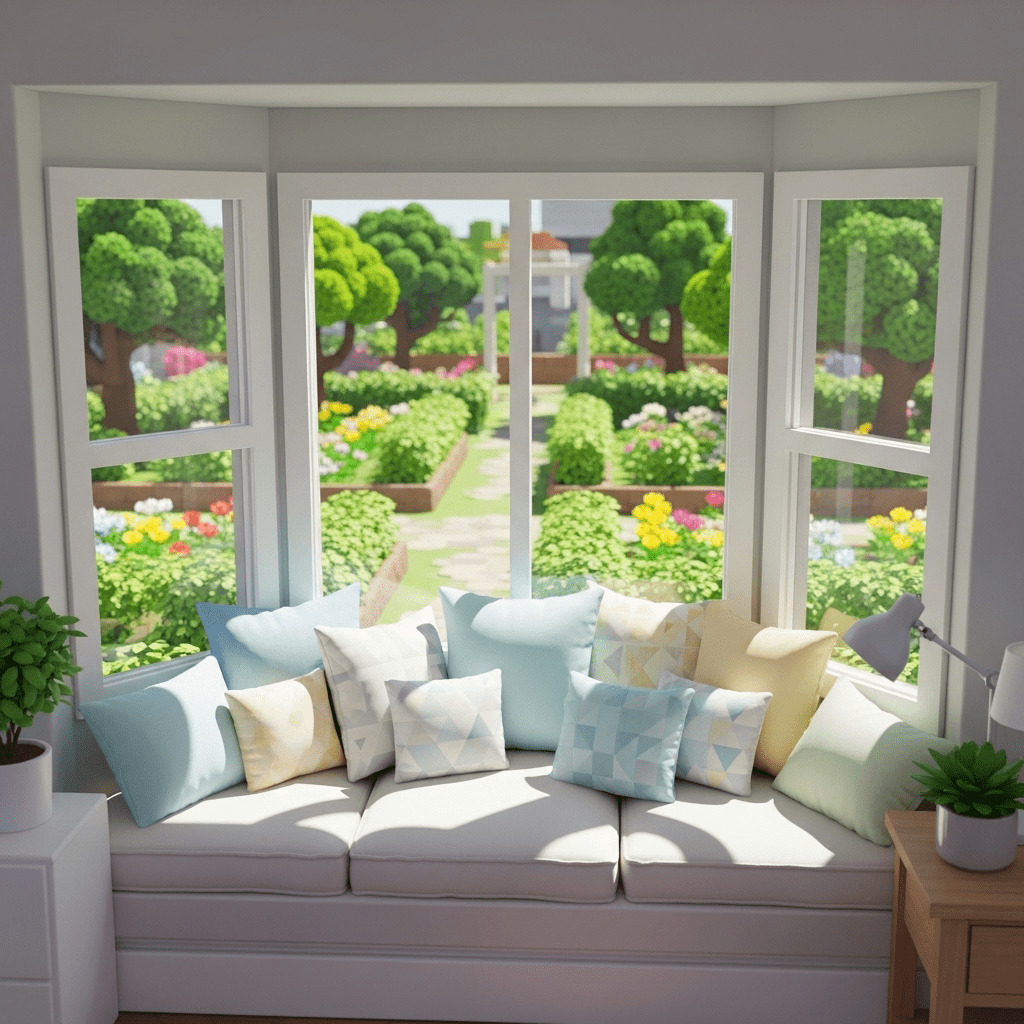 Cute bedroom ideas for small rooms bloxburg use a “Large Window” paired with a custom bench built from “Basic Shapes.” Adding a “Textured Blanket” and some pillows turns a simple window into a functional and cute seating area.