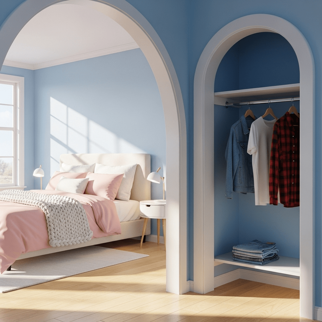 Cute bedroom ideas for small rooms bloxburg use the “Archway” structural item to separate the sleeping area from a small walk-in closet. Painting the arch a soft cream or linen color adds architectural depth to a tiny square room.