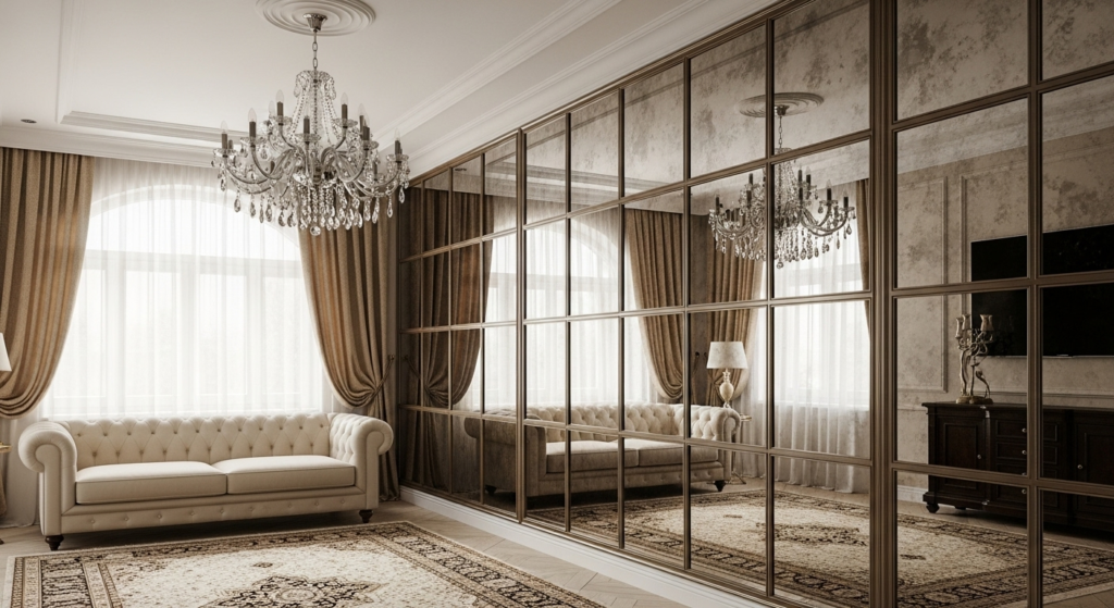 Create an accent wall using large mirrors or mirrored panels to visually double your space. This is particularly effective on long walls where the reflection creates the illusion of width. Frame mirrors for a more traditional look or use frameless panels for a modern, seamless appearance.