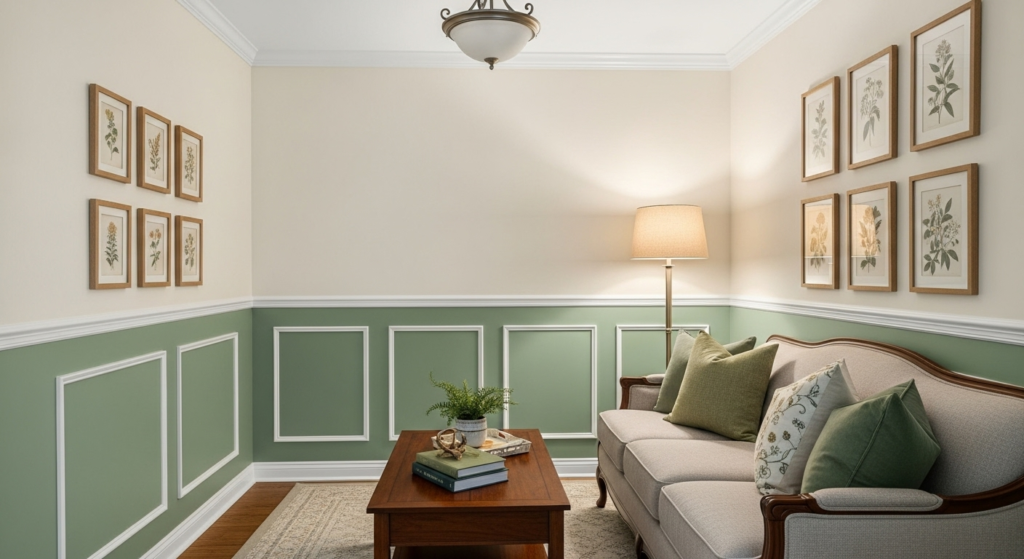 Divide an accent wall horizontally with two paint colors—a darker shade on the bottom half and lighter on top, separated by chair rail molding or a clean line. This technique adds architectural interest and can make ceilings appear higher while adding depth to your narrow space.