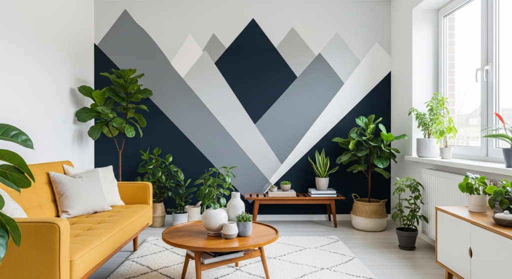 Paint a geometric design or mural on your accent wall to create a striking focal point. Triangles, chevrons, hexagons, or abstract shapes add contemporary flair and visual intrigue. The geometric pattern provides movement and energy that prevents the narrow room from feeling static.