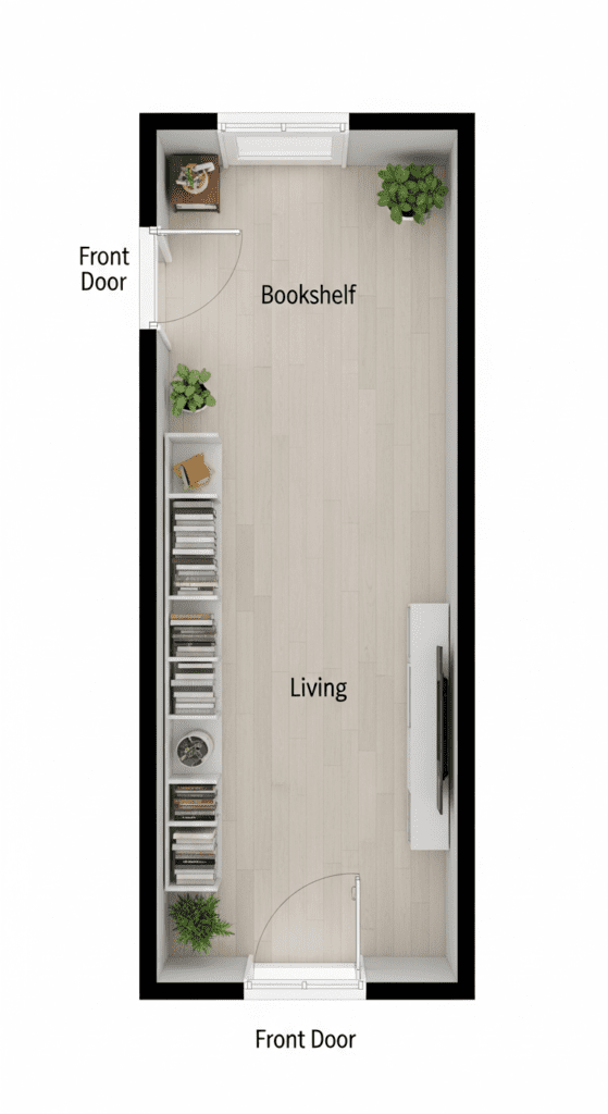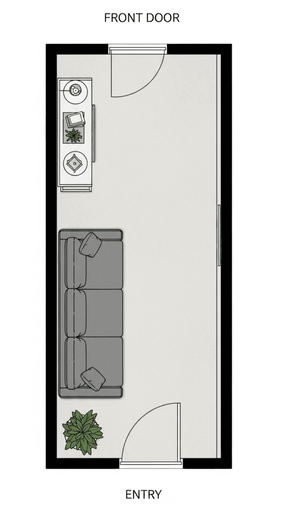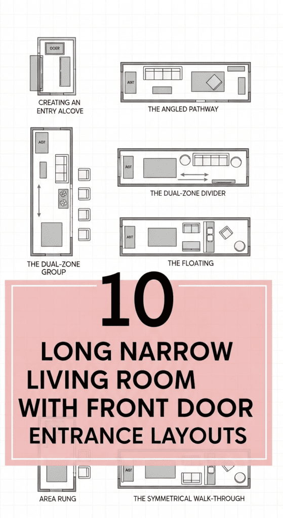 Long narrow living room with front door entrance layouts must balance welcoming guests with maintaining functional living space. When the front door opens directly into your living room, strategic furniture placement is crucial. Here are ten smart layouts for this common challenge.