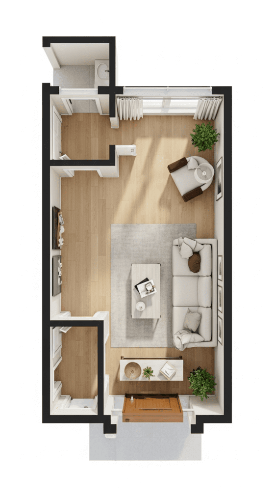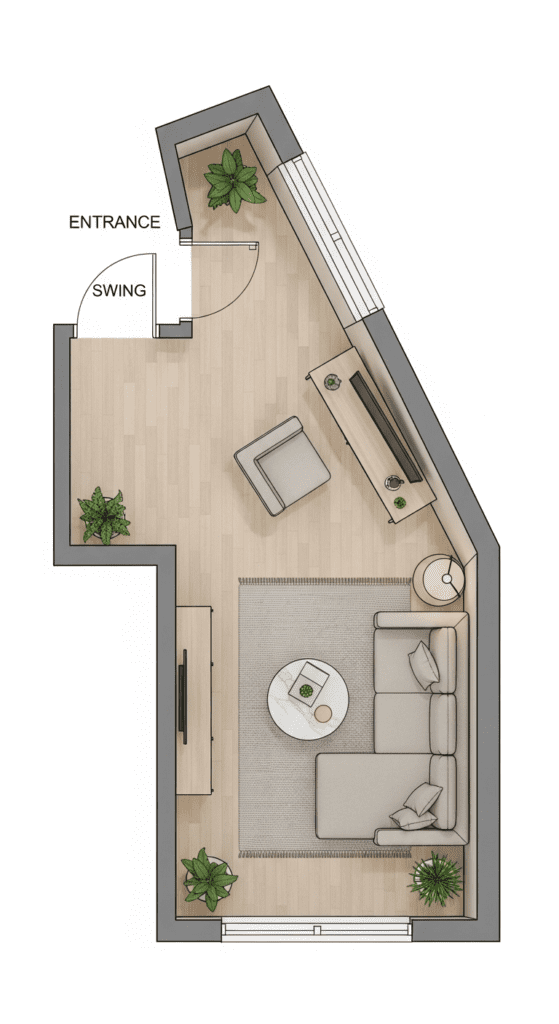 Clear Sight Lines: Arrange furniture so entering guests don’t see messy areas—TV cables, personal items, or unmade parts of open-plan spaces.