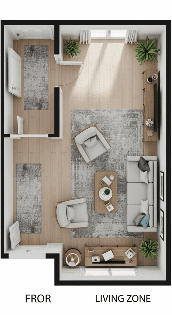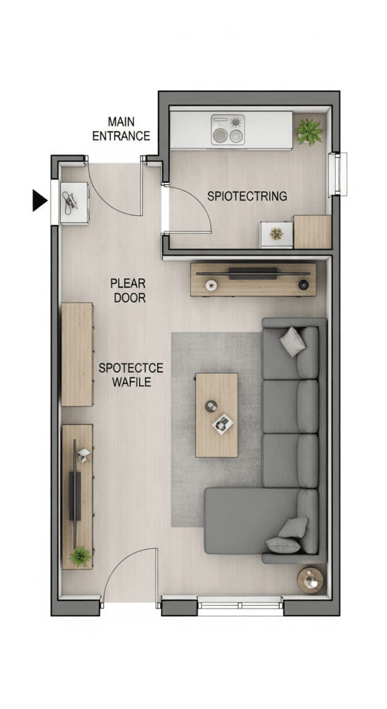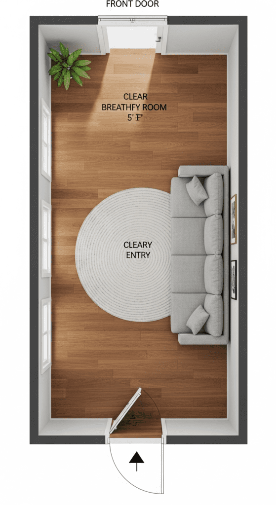 Maintain generous clear zone for coats, packages, and guest entry. Add only wall-mounted shelf or hooks. Living furniture begins after this clearance creating comfortable entry space.