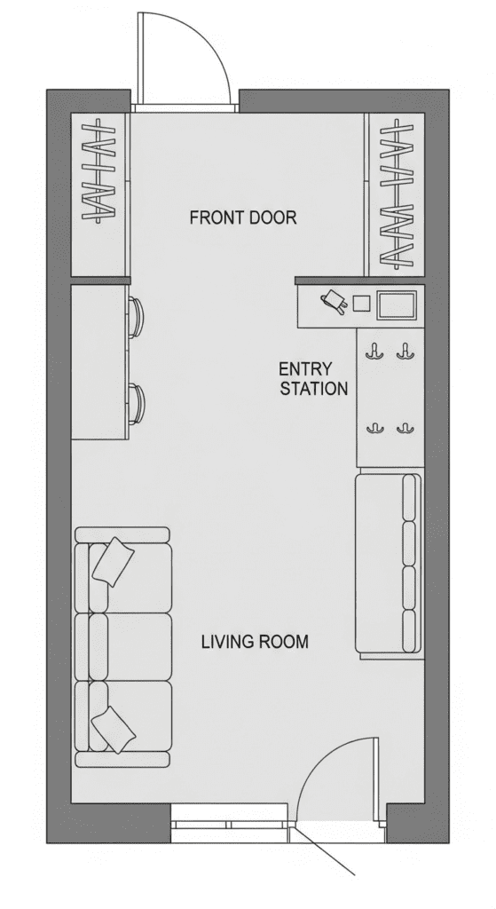 Coat Storage Essential: Provide hooks or closet access near door. Without proper storage, coats pile on living room furniture.
