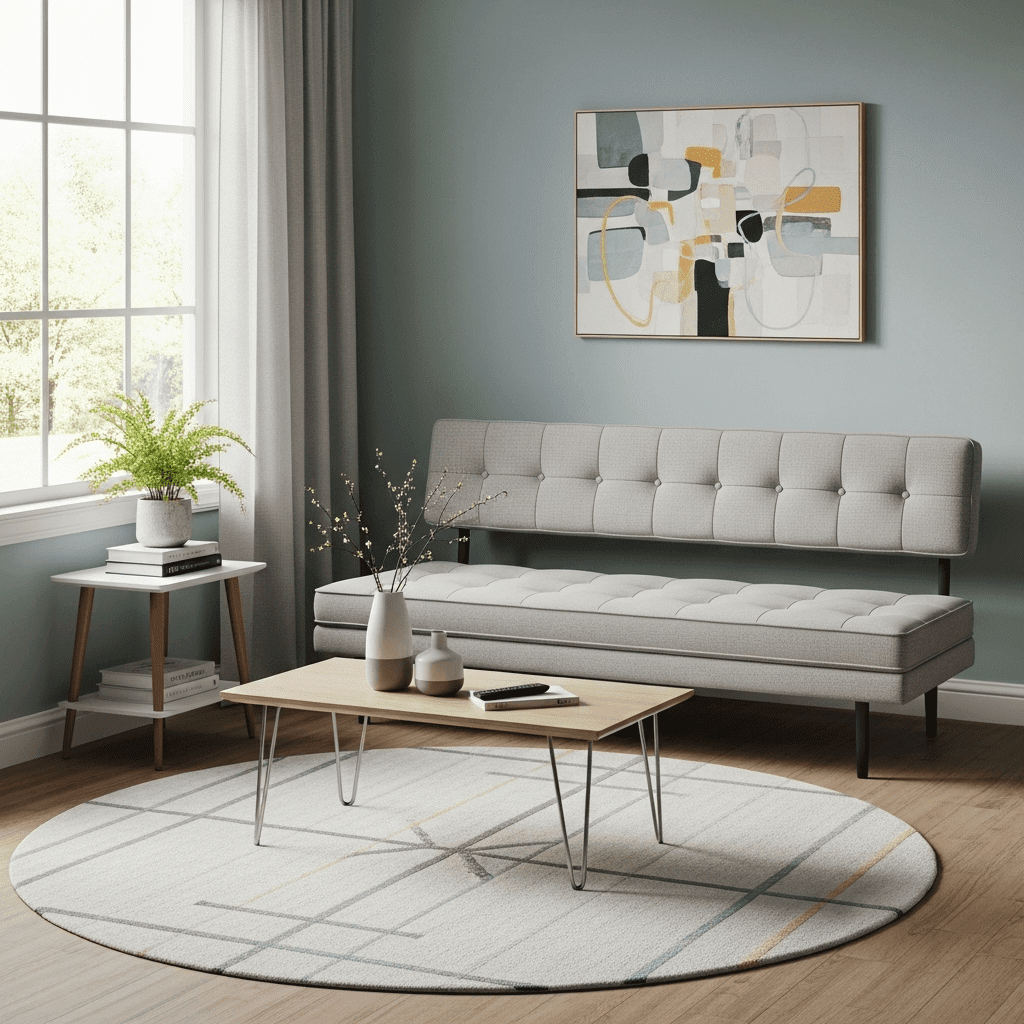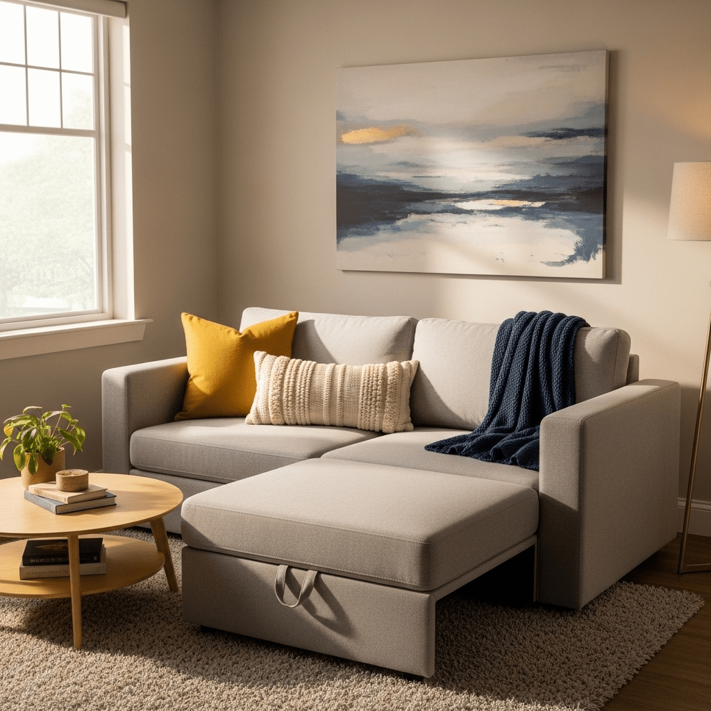 Sofa ideas for small living room versatility incorporate daybeds that lack a traditional heavy backrest. Using large cushions against a wall for support allows the piece to double as a guest bed while looking light and transitional.