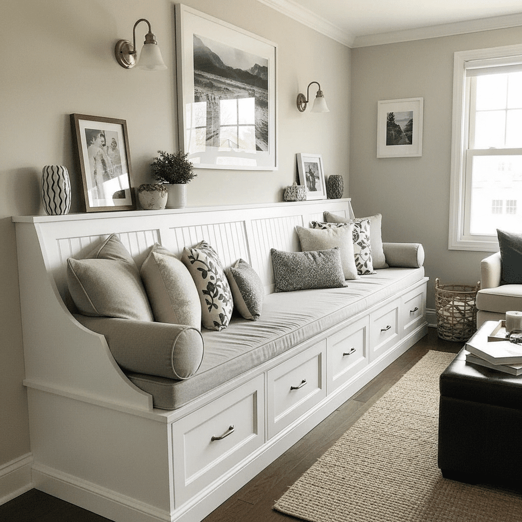Built-in banquettes maximize wall space while providing storage in the base. Top with a thick cushion and throw pillows to create comfortable seating. This permanent solution works beautifully in narrow living rooms where every inch counts.