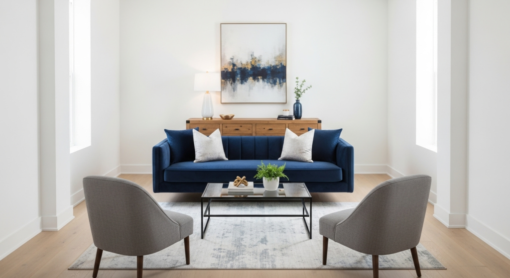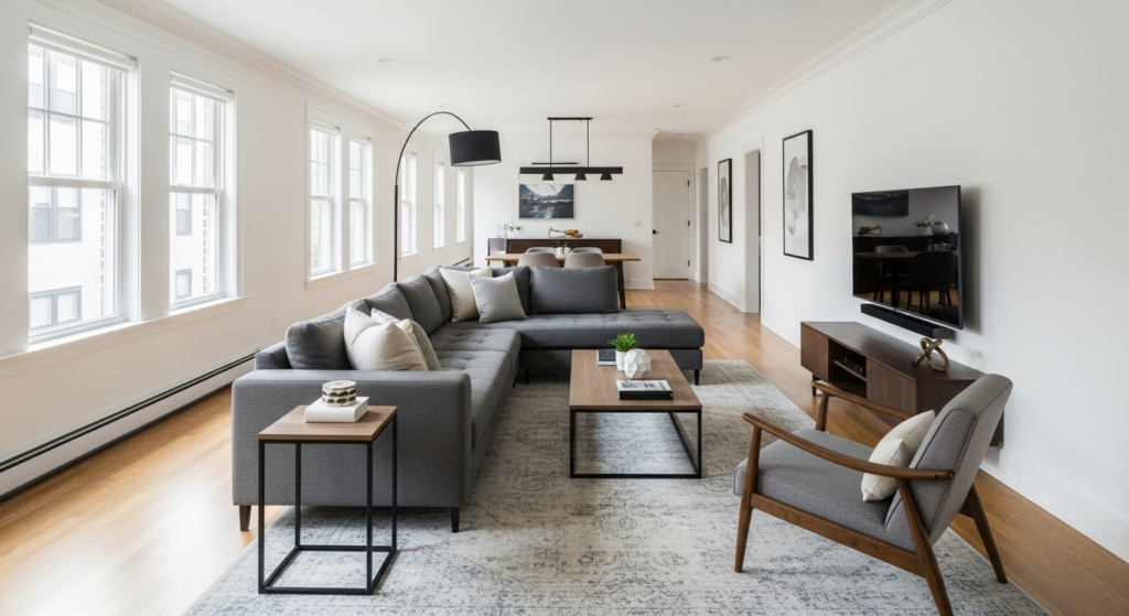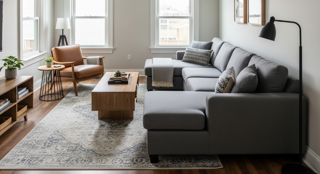 This arrangement accomplishes several objectives. It maximizes seating capacity in a small footprint, creates a cozy conversation area, and leaves the majority of the room’s center open for traffic flow. The perpendicular chaise section provides that crucial visual break across the width of the room, preventing the bowling alley effect.