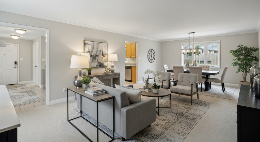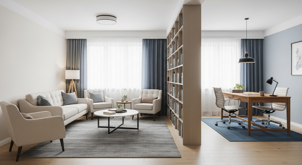 The key to making this work is clear visual separation without physical barriers. Use area rugs to define each zone—one rug under your main seating area and a different rug (even if in the same style family) under your secondary zone. Position a console table, bookshelf, or even just a floor lamp between the two areas to create a subtle boundary. This arrangement works beautifully because it gives purpose to the room’s length rather than fighting against it.