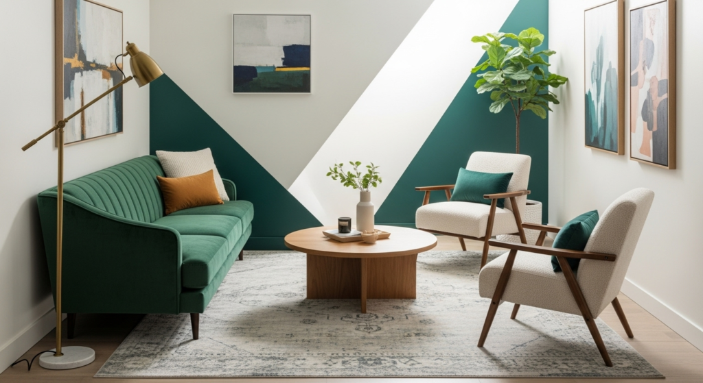 Start by placing your sofa at approximately a 45-degree angle in one corner of the room. Position chairs at complementary angles to create a conversation grouping that forms a rough circle or oval rather than the typical rectangle. The coffee table follows the angled lines, further emphasizing the diagonal orientation.