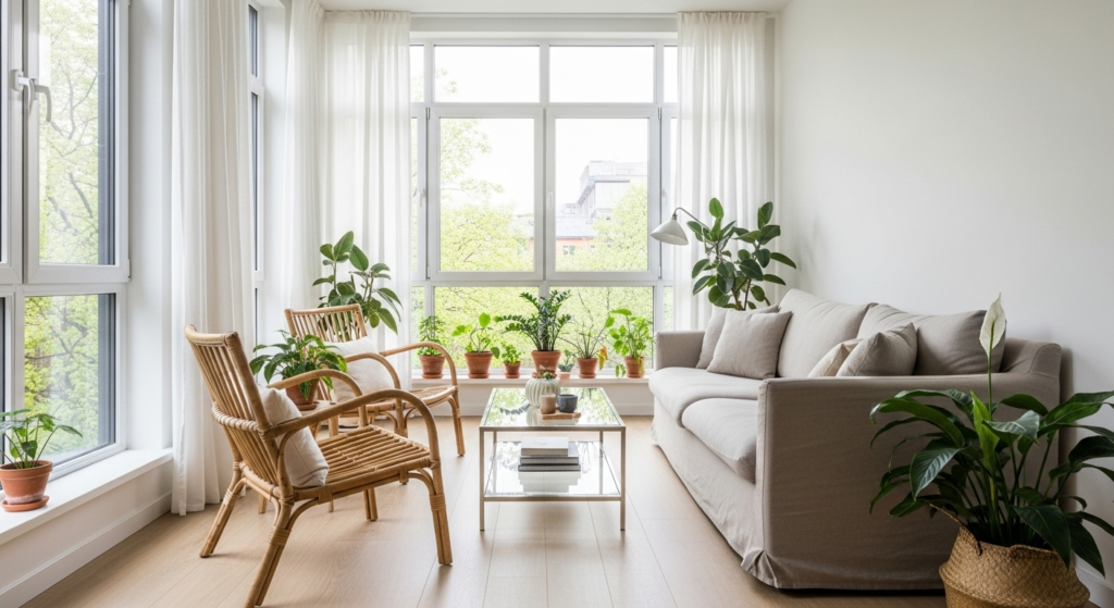 Arrange additional seating pieces to angle toward both the windows and each other, creating a conversation area that feels open and connected to the outdoors. Use lightweight, transparent furniture elements like glass coffee tables and open-frame chairs to maintain the airy feel. Opt for sheer curtains or natural woven shades that provide privacy when needed while still allowing light to filter through.