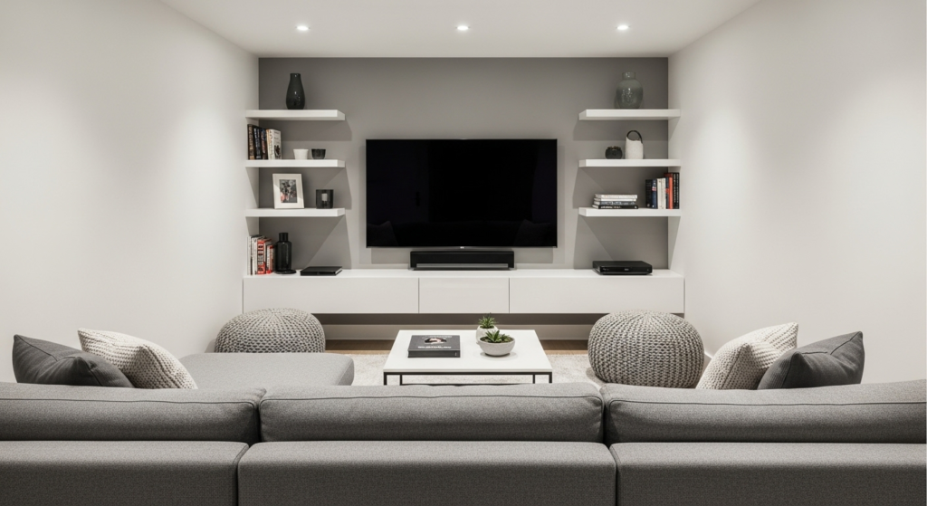 Mount your television on one of the short walls at the appropriate viewing height (typically with the center of the screen at seated eye level, about 42 inches from the floor). Position your main seating—whether a sofa, sectional, or loveseat—directly facing the TV at a distance that follows the viewing distance formula (screen size in inches multiplied by 1.5 to 2.5 for optimal viewing).