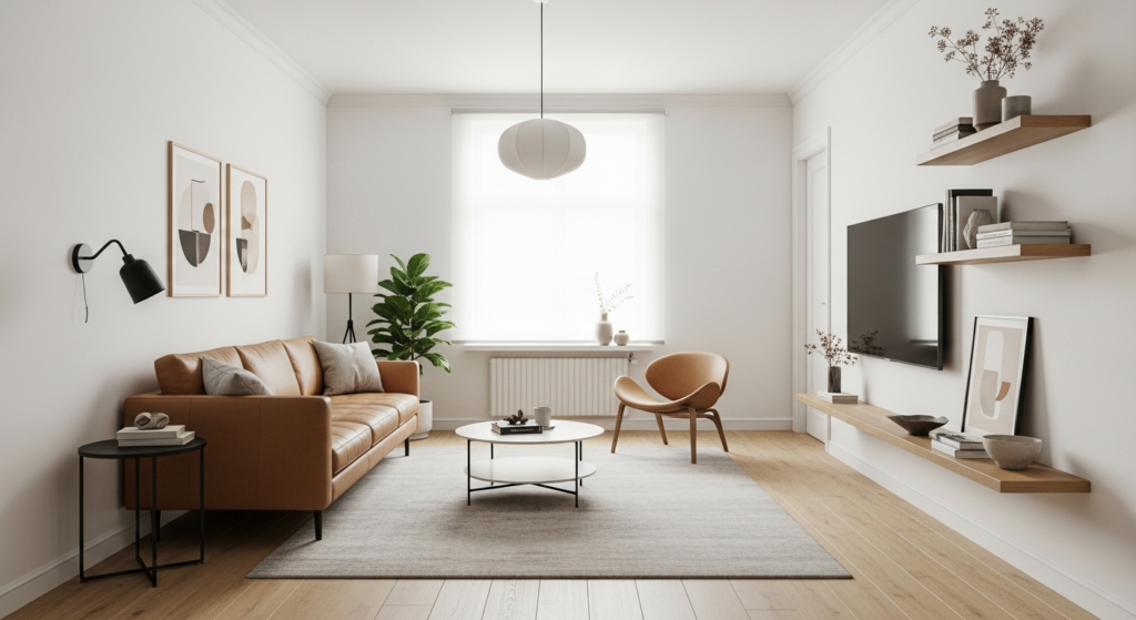 The minimalist arrangement works particularly well for small narrow living rooms where any attempt to fit in abundant furniture would create a crowded, uncomfortable feel. It’s also ideal for those who embrace minimalist lifestyle principles and prefer calm, uncluttered environments.