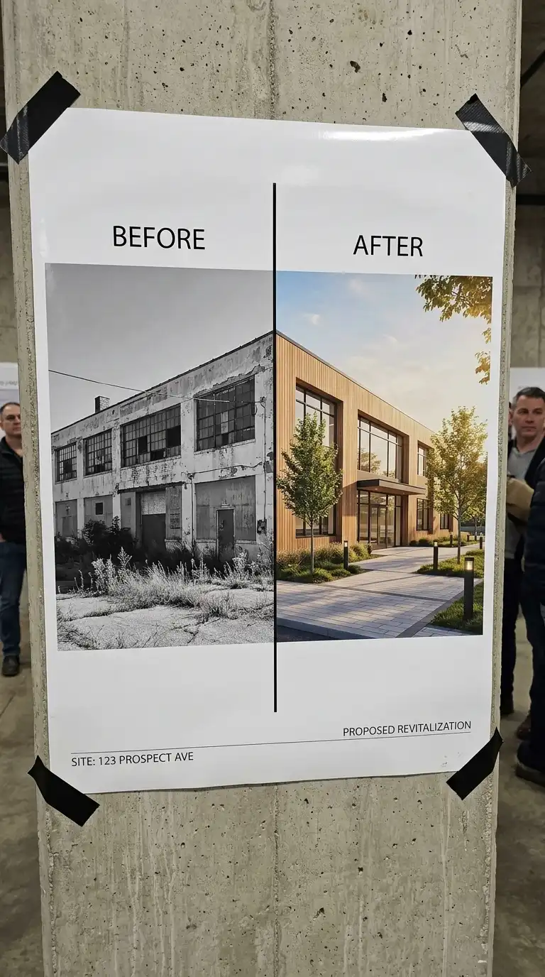 The before-and-after sheet shows the existing site or building alongside the proposed design. The two images are the same scale, same orientation, and same viewpoint. The comparison is direct and powerful. The sheet is split vertically or horizontally.