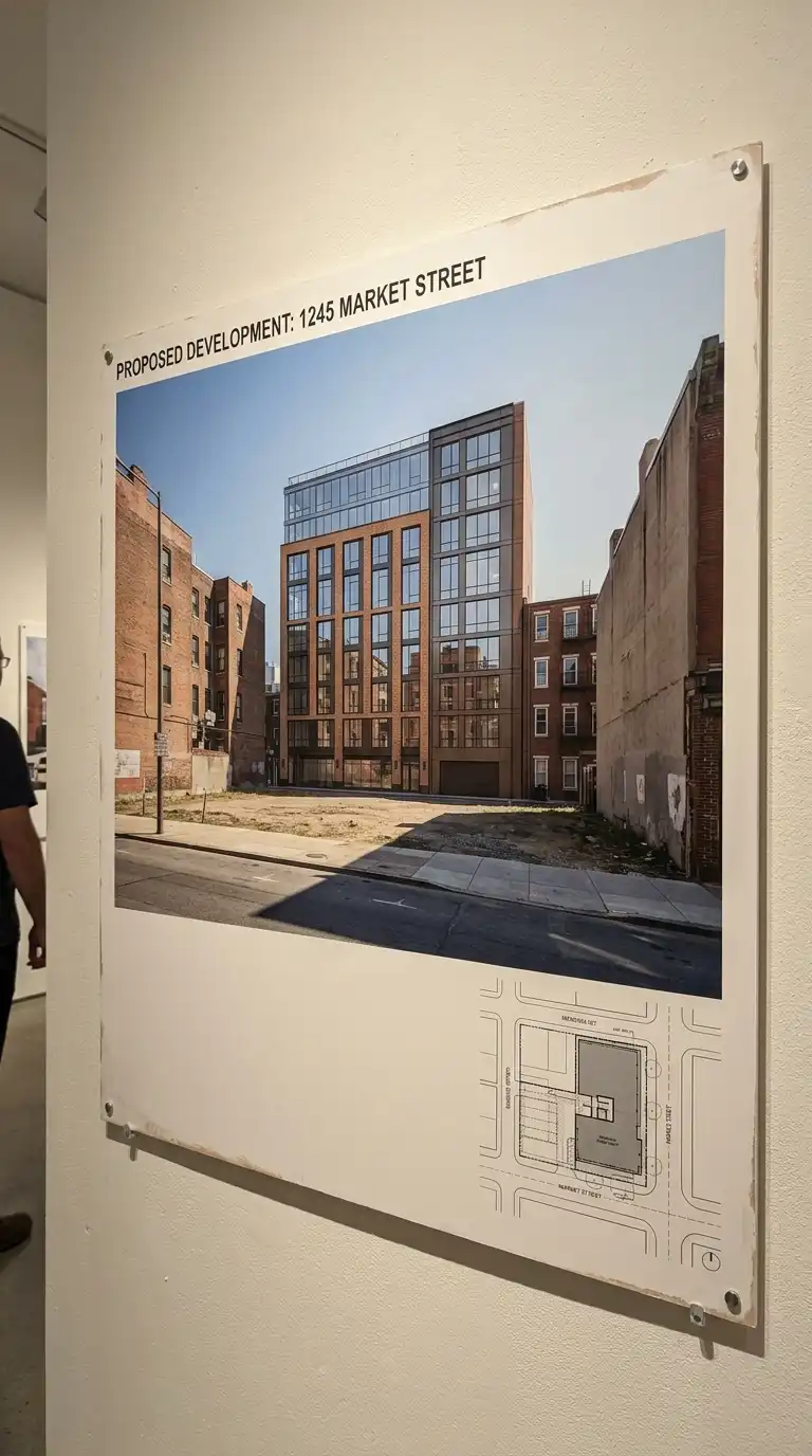 The site-specific sheet integrates the proposed building into photographs of the site. A rendering of the building is overlaid onto a photograph of the empty site. The building is drawn at the correct scale and perspective. The sheet may also include a site plan and context photos.