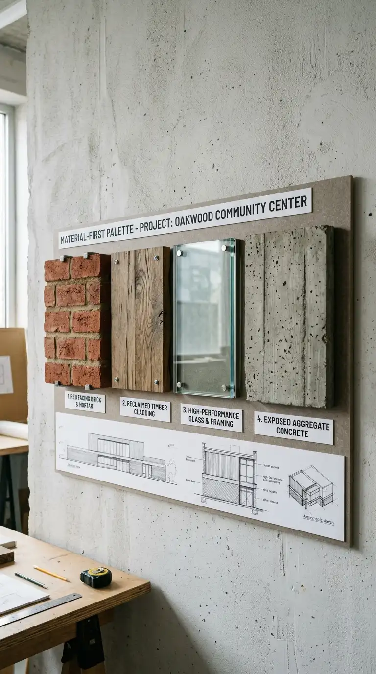 The material-first sheet prioritises material samples over drawings. The sheet includes actual samples of stone, wood, concrete, glass, and metal. The samples are arranged in a composition that reflects the building’s material strategy. Drawings are secondary — small and in the background.