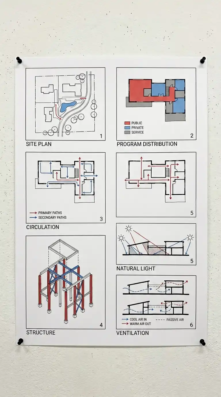 The diagram-only sheet uses no renderings, no photographs, no material samples. Only diagrams. The diagrams explain the building’s organisation: program, circulation, structure, light, ventilation, site. Each diagram is simple, graphic, and colour-coded.