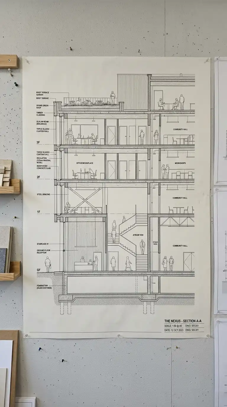 The large-scale section sheet uses a single section drawing at a very large scale. The section is printed at 1:50 or 1:20, covering most of the sheet. The drawing shows structure, material, program, and human figures at the same scale.