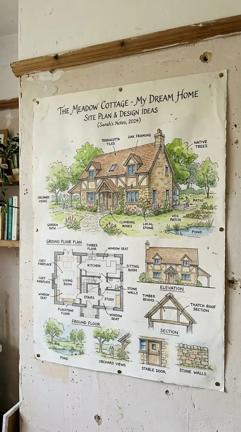 The hand-drawn sheet uses no digital tools. All drawings are hand-drawn: pencil, ink, watercolour. The drawings are mounted on the sheet. The handwriting is the typography. The sheet is personal and crafted.