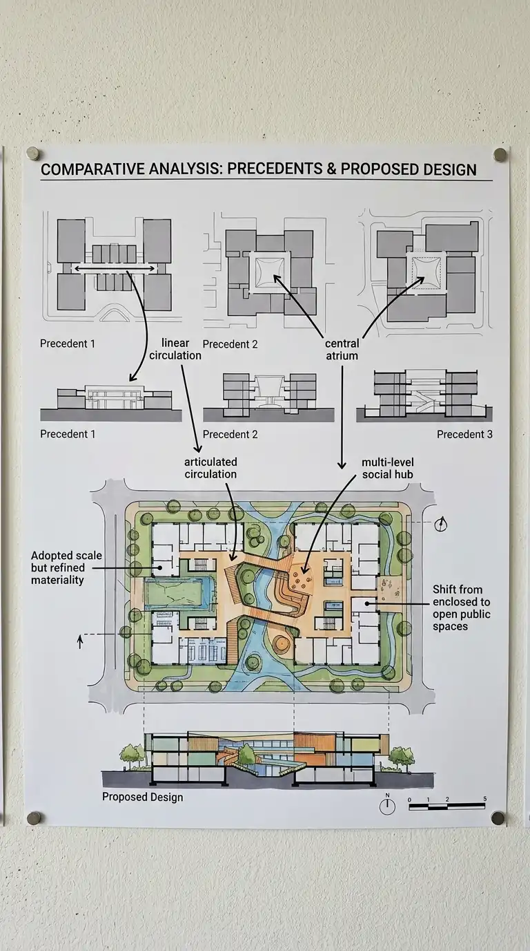 The comparative sheet shows the proposed design alongside precedents. The precedents might be historical buildings, contemporary projects, or the architect’s own earlier work. The comparison is visual and diagrammatic.