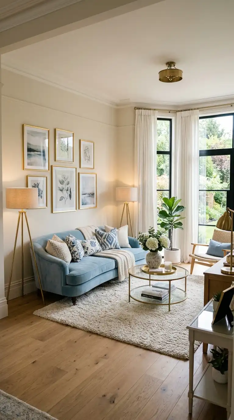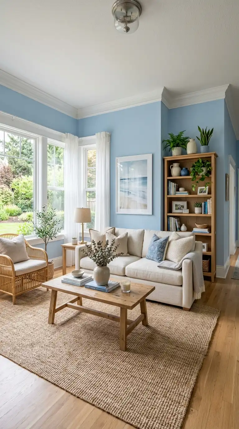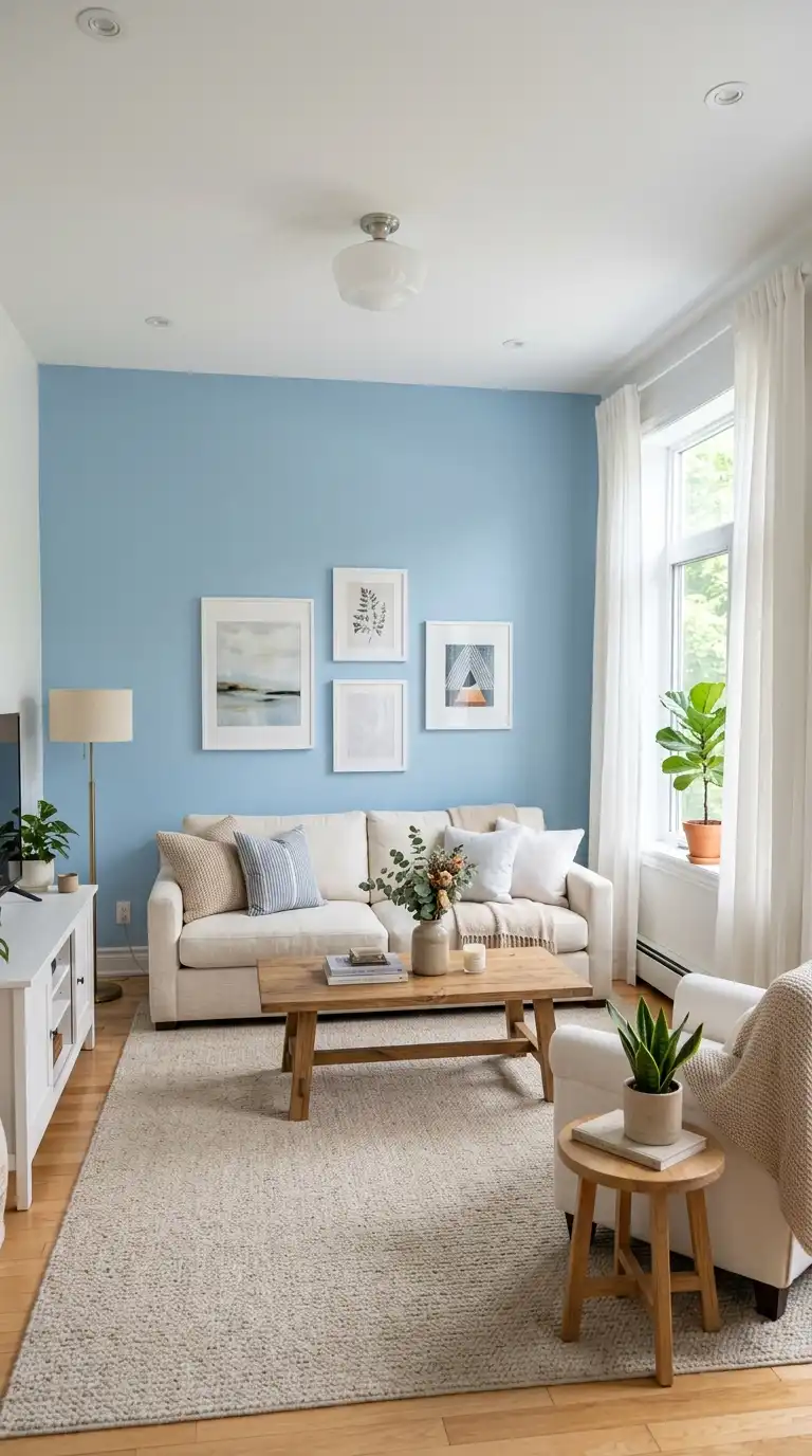 A baby blue accent wall adds a soft pop of color without overwhelming the room. It serves as a gentle backdrop for neutral furnishings—cream sofas, light wood coffee tables, and b