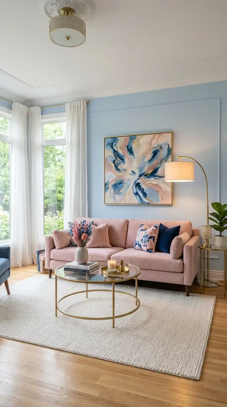 Baby blue and blush pink create a soft, romantic palette that feels both modern and timeless. The cool blue balances the warmth of pink, resulting in a space that is gentle, inviting, and effortlessly chic. Introduce blush through throw pillows, a velvet armchair, or artwork, and add gold or brass accents for warmth and elegance.