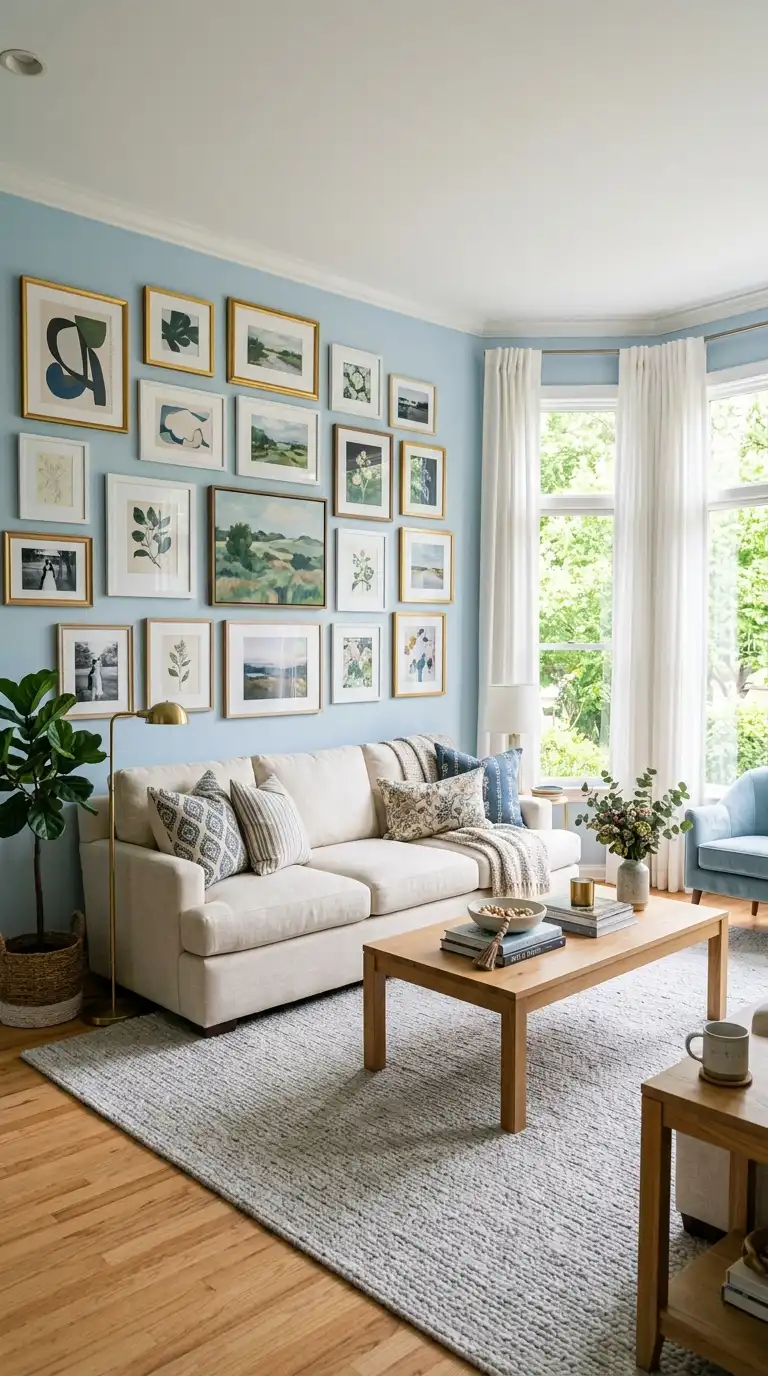 Baby blue walls serve as a stunning backdrop for a gallery wall, allowing artwork to take center stage. The soft hue complements a wide range of art styles—from black and white photography to colorful abstracts and botanical prints. Use a mix of frame finishes—gold, silver, wood, and white—to add visual interest, and arrange the artwork in a cohesive layout that draws the eye.