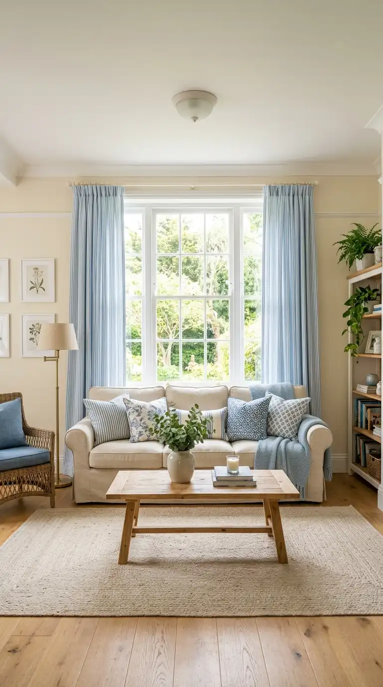 Baby blue and white striped curtains add classic, graphic appeal to a living room. The vertical stripes draw the eye upward, making ceilings appear higher, while the soft blue and crisp white combination feels fresh and timeless. Pair them with neutral walls in cream or light gray, and incorporate blue accents in pillows and accessories to tie the palette together.
