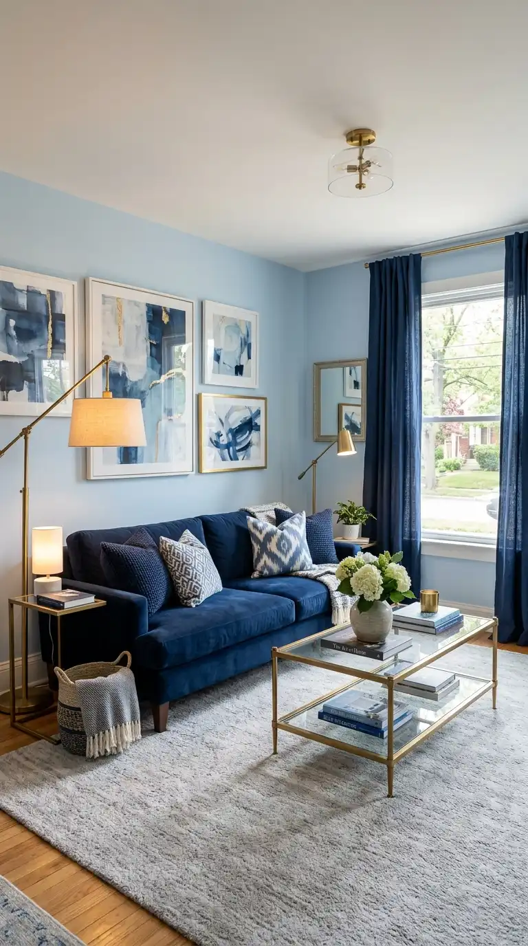 Layering baby blue with deeper navy creates a sophisticated monochromatic palette with depth and contrast. Use baby blue on walls or larger furniture pieces, and introduce navy through accent chairs, curtains, pillows, or area rugs. The combination feels cohesive, intentional, and visually interesting without introducing additional colors. Brass or gold accents add warmth and elevate the overall look.