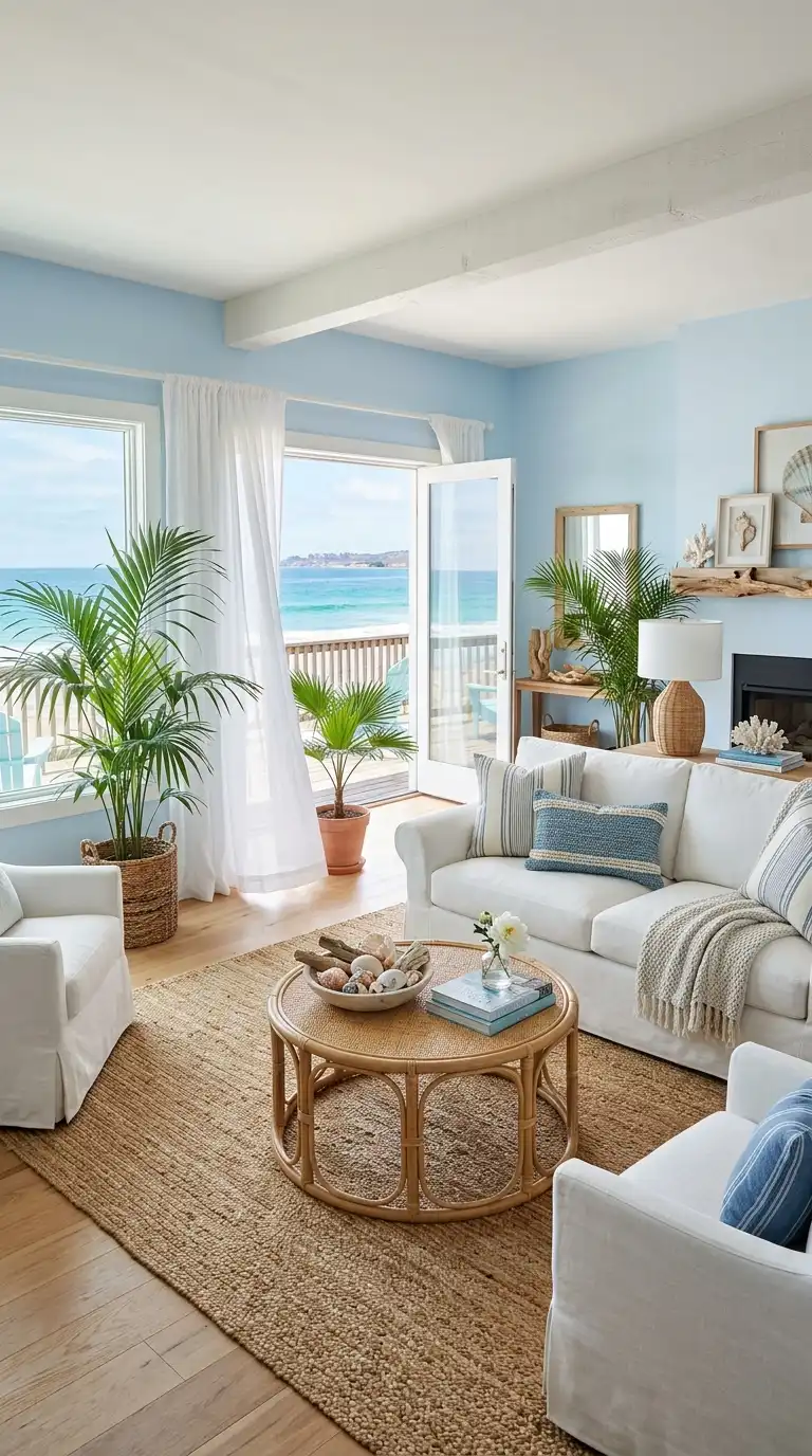 Baby blue is a natural fit for coastal-inspired interiors. Pair baby blue walls or a baby blue sofa with white slipcovered furniture, rattan accents, and natural textures like jute, linen, and weathered wood. The palette evokes the colors of the sky and sea, creating a relaxed, breezy atmosphere. Add woven baskets, driftwood accents, and plenty of greenery to complete the coastal aesthetic.