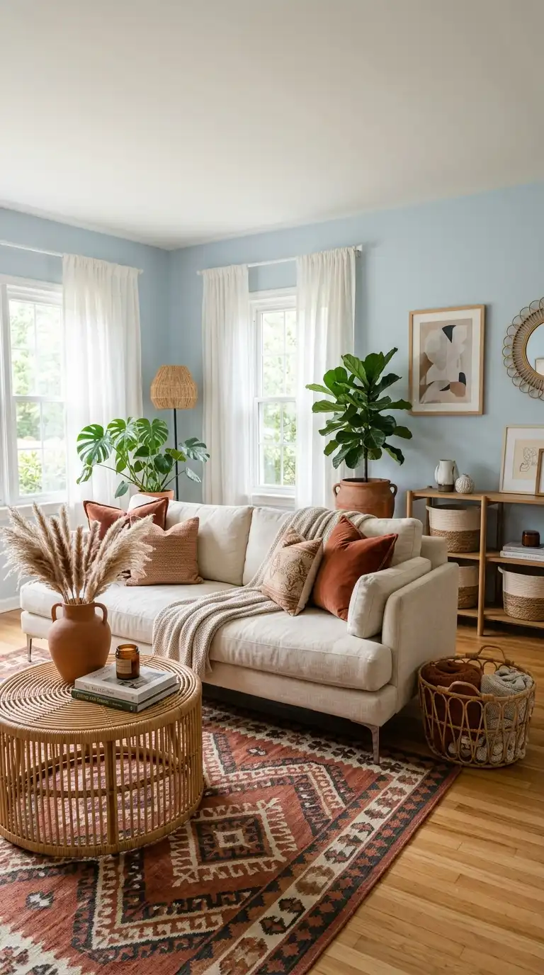 Baby blue and terracotta create a warm, earthy palette that feels grounded and inviting. The cool blue balances the warm, rustic terracotta, while woven textures in jute, rattan, and wicker add organic depth. Introduce terracotta through clay pots, rust-colored pillows, or a terracotta area rug, and use natural wood furniture to enhance the grounded feel.