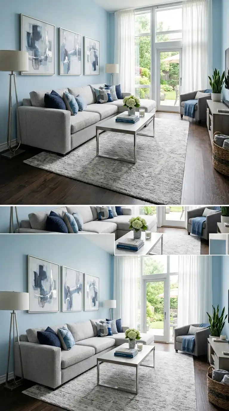 Baby blue and gray create a cool, contemporary palette that feels sleek and sophisticated. Use baby blue on walls or a sofa, and pair with a gray sectional or gray accent chairs. Silver or chrome accents in lighting, coffee table bases, and decorative accessories enhance the modern edge. A light gray area rug and sheer white curtains keep the space feeling open and bright.