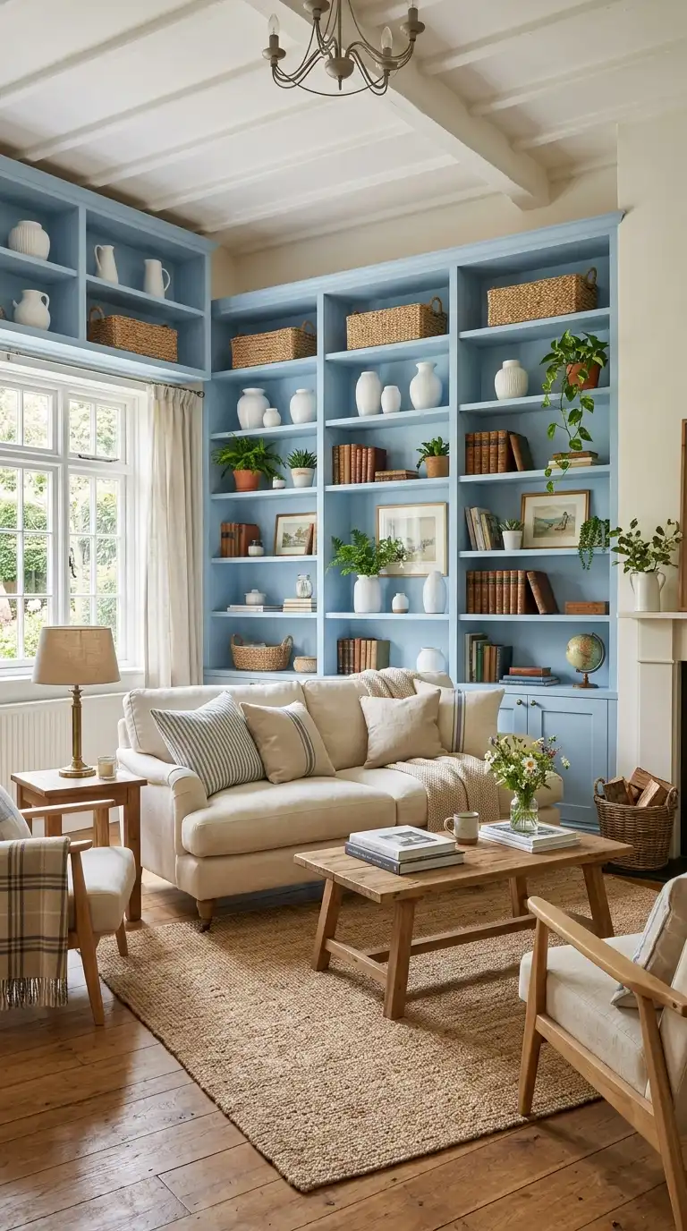 Built-in shelving or cabinetry painted in baby blue adds architectural interest and a soft pop of color to a living room. The delicate blue hue feels fresh and timeless, making it a perfect choice for traditional, farmhouse, or coastal interiors. Style the shelves with white ceramics, natural wood accents, woven baskets, and a mix of books and greenery to create contrast and visual appeal.