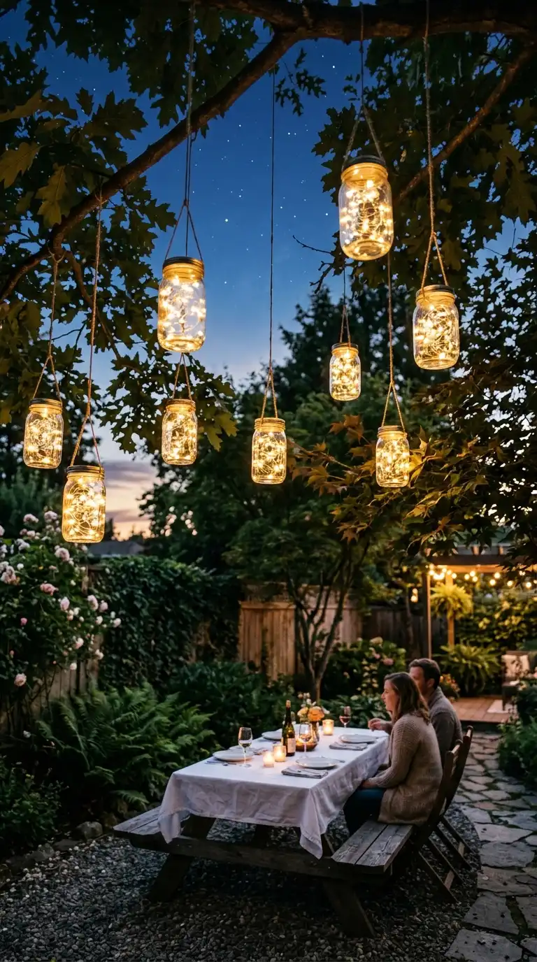 Fill mason jars with battery-operated fairy lights or small candles. Tie twine or wire around the jar rims. Hang them from tree branches, shepherd’s hooks, or a clothesline strung across the yard. Cluster them at different heights. When dusk falls, they glow like fireflies.