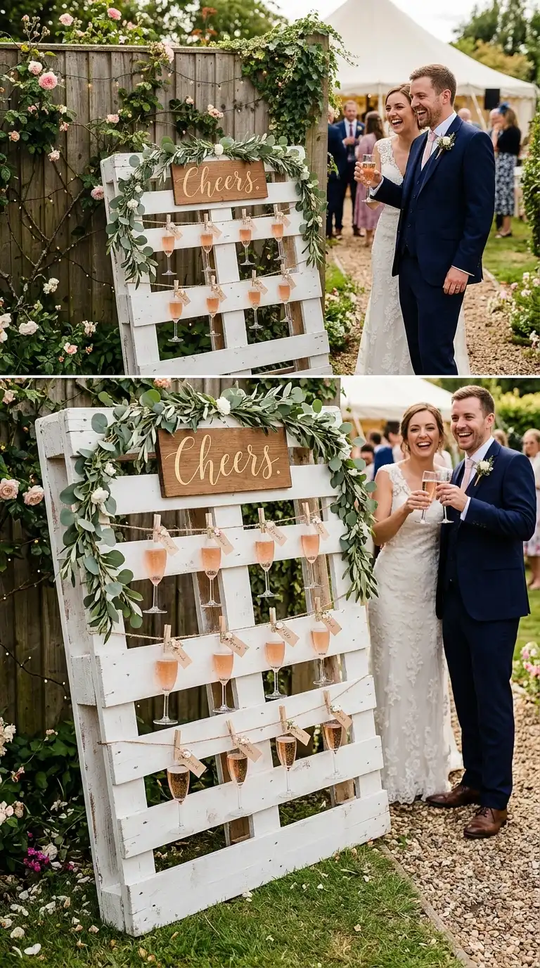 Build or buy a wooden pallet or pegboard. Attach small wire cups or clips to hold champagne flutes. Fill the flutes with pink lemonade, sparkling cider, or real champagne. Guests grab a drink and instantly have a photo backdrop. Add a sign that says “Cheers to the Future Mr. & Mrs.”