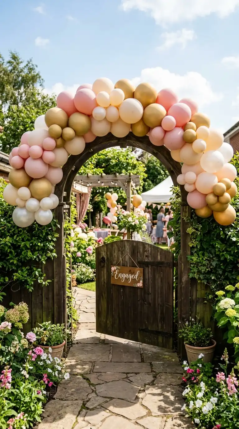 Create a balloon arch over the gate, pathway, or entrance to the party area. Use pastel or metallic balloons in the couple’s wedding colors. No helium needed—inflate with air and attach to a flexible arch frame or fishing line between two posts. It says “something special is happening here.”