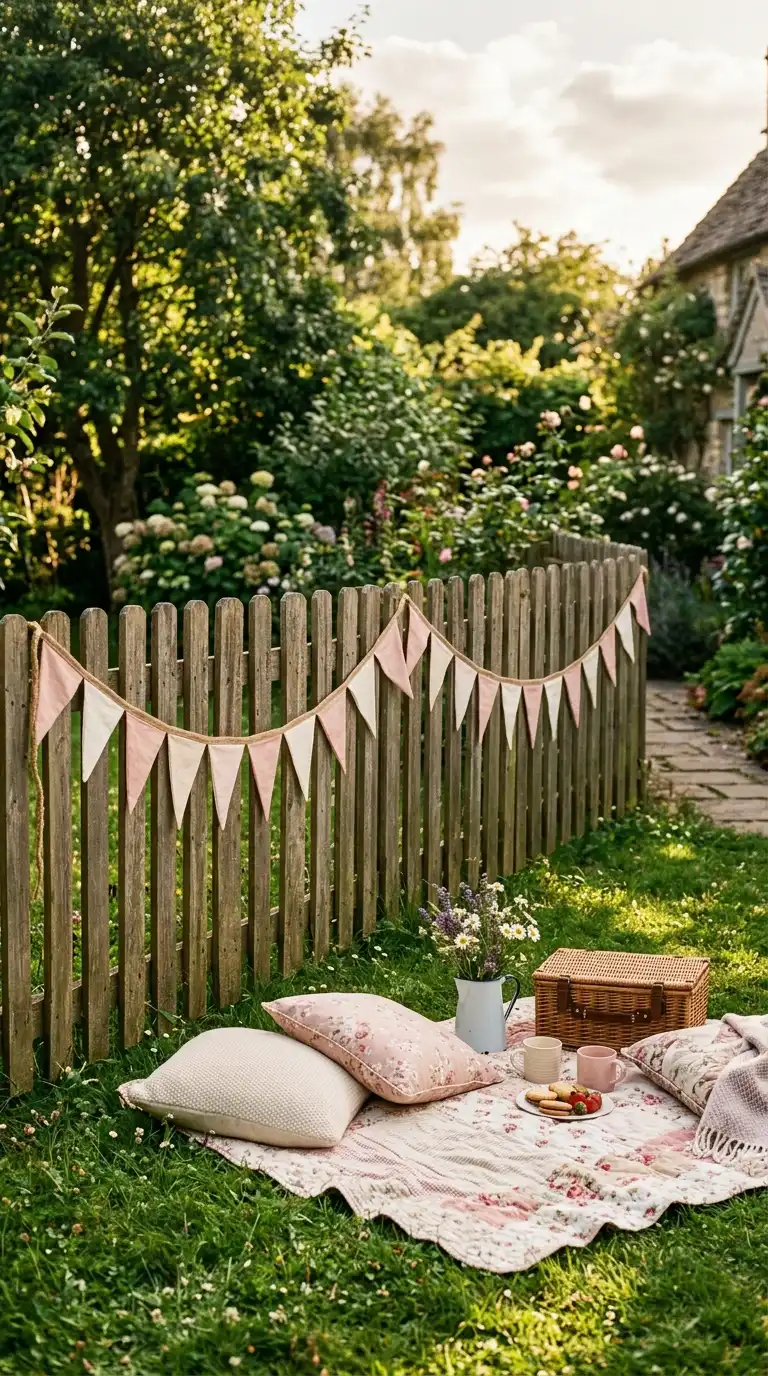 String fabric bunting (pre-made or DIY from scrap fabric) across fences, trees, or the house. Use neutral tones (cream, beige, blush) or bold colors. The triangles flutter in the breeze and instantly add a festive, garden-party feel. Cheap, reusable, and incredibly forgiving.