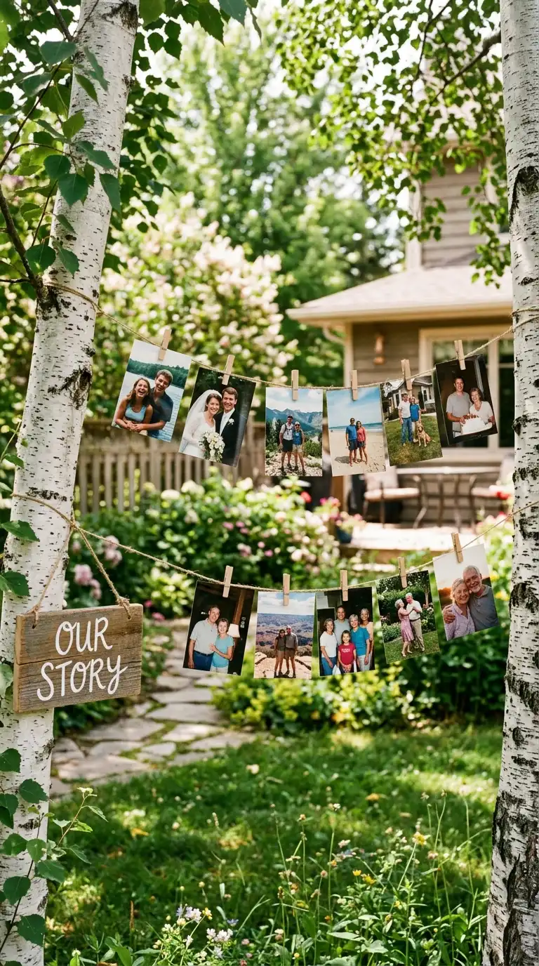 Hang a clothesline between two trees or posts. Use mini clothespins to attach printed photos of the couple: childhood pictures, early dating photos, vacation shots, and the engagement photo. Guests walk along the line and watch the couple’s story unfold. Instant conversation starter.