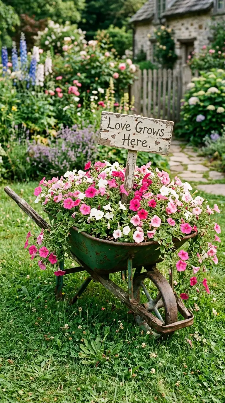 Take an old garden wheelbarrow (or a new cheap one). Line it with a plastic trash bag, then fill it with potting soil. Plant a mix of annuals (petunias, marigolds, or geraniums) in the couple’s colors. Or simply fill it with cut flowers in water-filled jars. Park it near the entrance or dessert table.