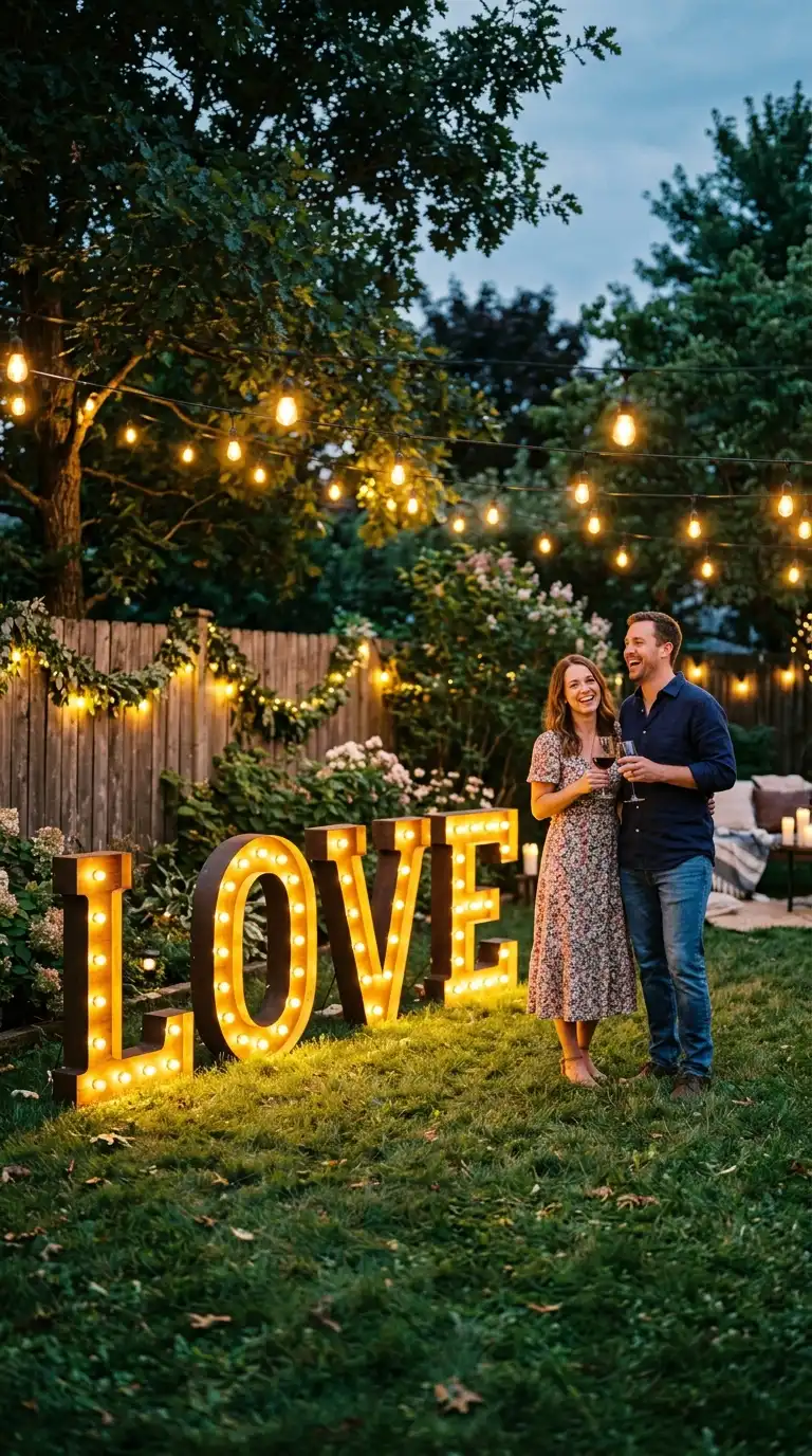 Buy or rent large marquee letters (light-up) that spell L-O-V-E or the couple’s initials. Place them on the ground near the dessert table or along a pathway. During the day, they’re sculptural. At night, they glow warmly. If renting is too expensive, make faux letters from cardboard and string lights.