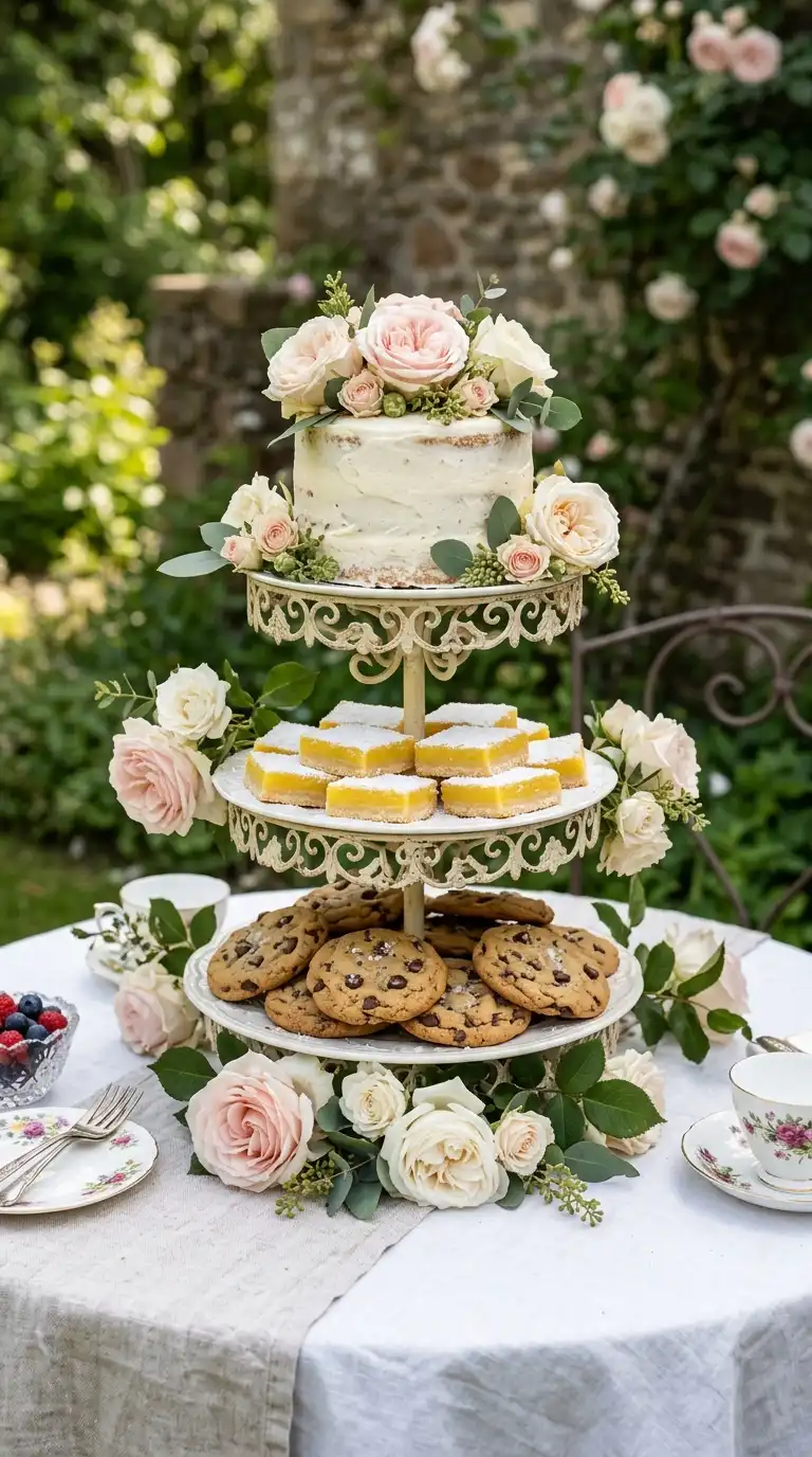 Even a simple dessert (cookies, brownies, or a small cake) looks special on a tiered stand. Use a thrifted three-tier cake stand or stack mismatched plates on overturned cups. Add fresh flowers between the tiers. Label each dessert with a small tent card. The table becomes a centerpiece.