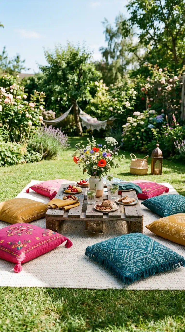 For a casual engagement party, skip chairs. Lay down a large outdoor rug or a quilt. Scatter floor pillows and low poufs. Place a few low wooden crates or pallets as tables. Guests sit cross-legged, eat off small plates, and lean back on pillows. Relaxed, bohemian, and perfect for mingling.