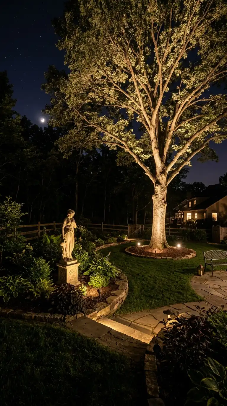 Uplighting adds drama and depth by illuminating trees, sculptures, and architectural features from below. Place well lights or spotlights at the base of mature trees, shrubs, or pergolas, angled upward. The effect highlights the texture of bark, the shape of branches, and the height of structures. Uplighting creates stunning focal points and adds a sense of grandeur to your backyard.