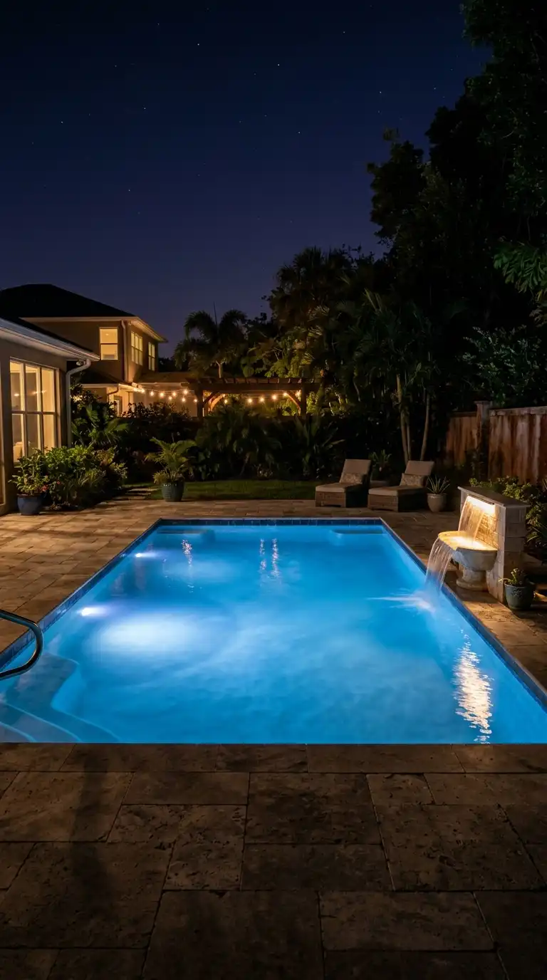 Lighting your pool or water feature transforms it into a stunning nighttime focal point. Use LED lights designed for underwater use to illuminate the pool from within. Color-changing lights allow you to set different moods—calm blue for relaxation, vibrant colors for parties. Also light fountains, ponds, and waterfalls to highlight the movement of water.