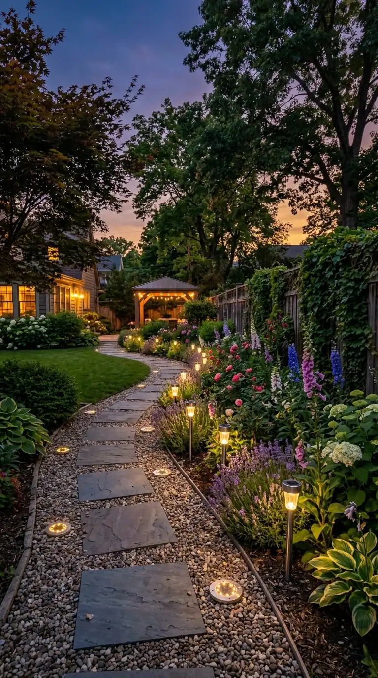Path lights guide guests safely through your yard while adding a soft, decorative glow. Use low-voltage or solar-powered lights along walkways, garden paths, and driveways. Choose from various styles—metal lanterns, mushroom caps, or bollard lights—to match your aesthetic. Space them evenly to create a continuous line of light. Path lights also highlight the contours of your landscape.