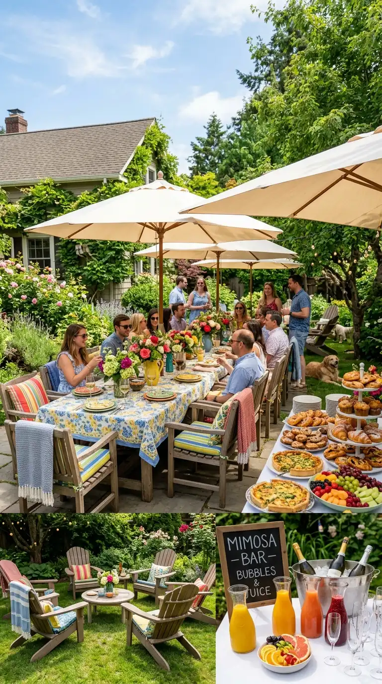 A backyard brunch is a delightful daytime event. Set up a long table with a cheerful tablecloth, fresh flowers, and casual place settings. Serve a buffet of breakfast and brunch favorites—pastries, quiche, fresh fruit, yogurt, and a mimosa bar. Provide shade with umbrellas or a pergola, and add soft music in the background. Use comfortable seating with cushions for a relaxed, leisurely atmosphere.