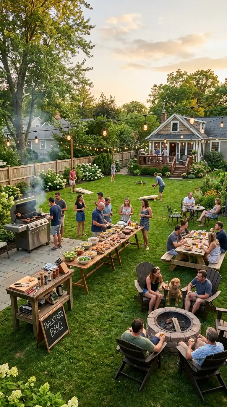 A casual barbecue is all about relaxed comfort and easy flow. Set up a grill station with a prep table nearby, and arrange seating in clusters around the yard—a picnic table for dining, Adirondack chairs around a fire pit for lounging, and a few bistro sets for intimate conversation. Use a long folding table for a buffet-style food spread, and add a cooler filled with drinks. String lights overhead create a warm, festive atmosphere, and lawn games like cornhole or bocce keep guests entertained.